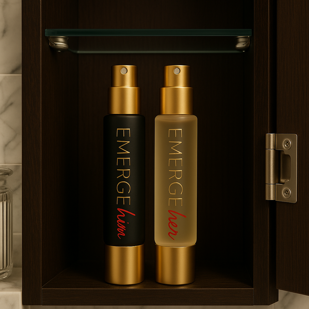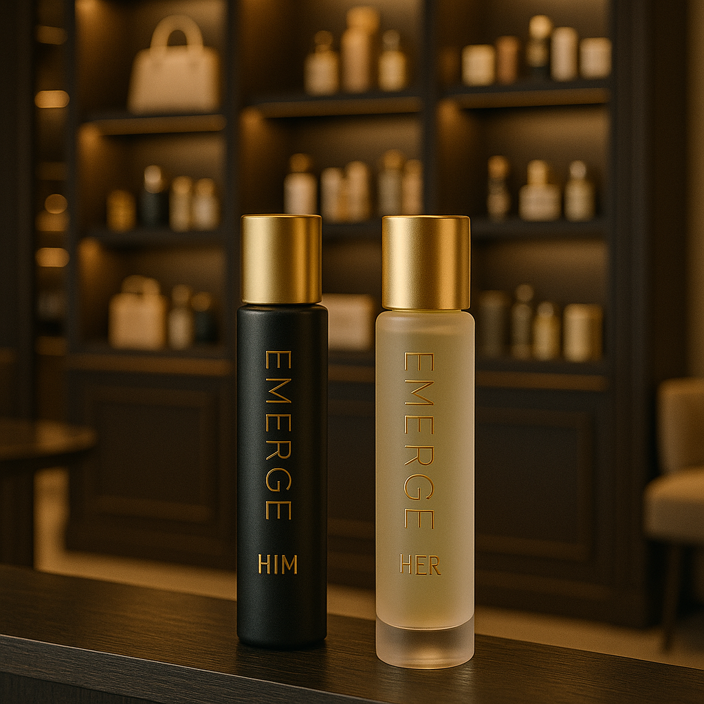 A sophisticated perfume/oil brand designed as a perfect set for both him and her. At the heart of Emerge is the enchanting essence of pure vanilla, celebrated for its warm, inviting, and universally appealing aroma. This dual collection is crafted to complement the unique qualities of both men and women, creating a harmonious blend of elegance and allure.